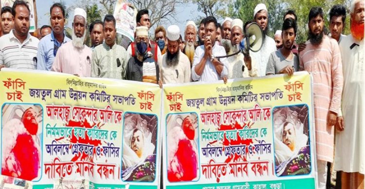 বগুড়া প্রতিনিধি: বগুড়ার কাহালুর জয়তুল গ্রাম উন্নয়ন কমিটির সভাপতি ও বিশিষ্ট মৎস্যচাষী মরহুম আলহাজ্ব সেকেন্দার আলীর হত্যাকারী রাকিব ও জিহাদ সহ অন্যান্য আসামীদের অভিলম্বে গ্রেফতার ও ফাঁসির দাবীতে রবিবার (১৩মার্চ) সকালে জয়তুল গ্রামবাসীর উদ্যোগে স্কুল মাঠে এক মানব বন্ধন কর্মসূচী পালন করা হয়।