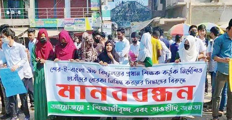 এ বিষয়ে জানতে চাইলে শের-ই বাংলা উচ্চ বিদ্যালয়ের প্রধান শিক্ষক মো. মোজাম্মেল হোসেন বলেন, বোরকা নিষিদ্ধ করা হয়নি। গত ৯ মার্চ এক বিজ্ঞপ্তিতে বলা হয়েছে, ছাত্রীরা শ্রেণিকক্ষে বোরকা খুলে ক্লাস করবে এবং ফেরার পথে বোরকা পরে বাড়ি ফিরবে। কিন্তু ১০ মার্চ বিদ্যালয় পরিচালনা পর্ষদের সিন্ধান্ত মোতাবেক পুনরায় আগের সিন্ধান্ত সম্পূর্ণ বাতিল করা হয়। তৃতীয় কোনো পক্ষের ইন্ধনে এ মানববন্ধন হয়েছে।