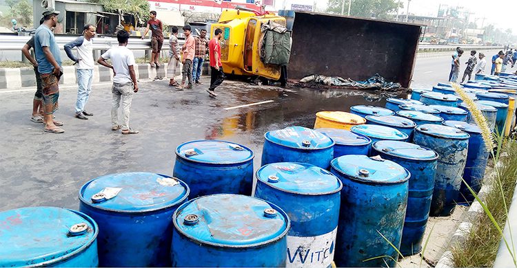 বৃহস্পতিবার (২৪ মার্চ) বেলা সাড়ে ১১টার দিকে ঢাকা-টাঙ্গাইল-বঙ্গবন্ধু মহাসড়কের আশেকপুর বাইপাস এলাকায় এ দুর্ঘটনা ঘটে। এতে কেউ হতাহত না হলেও ট্রাকে থাকা ড্রাম থেক সয়াবিন তেল মহাসড়কে পড়ে যান চলাচল বিঘ্নিত হচ্ছে।
