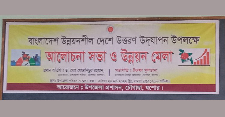 রায়হান হোসেন, চৌগাছা (যশোর): যশোরের চৌগাছায় বাংলাদেশ উন্নয়নশীল দেশে উত্তরণ উদযাপন উপলক্ষে আলোচনা সভা ও উন্নয়ন মেলা অনুষ্ঠিত হয়েছে। উপজেলা প্রশাসনের আয়োজনে বৃহস্পতিবার (২৪ মার্চ) দুপুর ১২ টায় উপজেলা পরিষদ মিলনায়নে এ সভা অনুষ্ঠিত হয়।