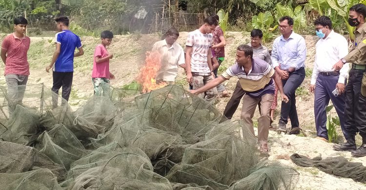 বৃহস্পতিবার সকাল ১০ টা থেকে দুপুর ১টা পর্যন্ত চিত্রা নদীর বিভিন্ন স্থানে অভিযান চালিয়ে প্রায় ৫’শ মিটার চায়না কারেন্ট জাল জব্দ করে আগুনে পুড়িয়ে বিনষ্ট করা হয়।