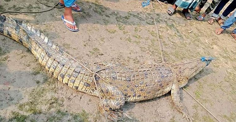 স্থানীয়রা বলেন, সোমবার বিকেল থেকে স্থানীয় এক ব্যক্তি তার ছয়টি হাঁস খুঁজে পাচ্ছিলেন না। পরে পুকুরে হাঁসের পালক ভাসতে দেখে সন্দেহ হলে জাল টানা হয়। এ সময় জালে একটি কুমির আটকা পড়ে।