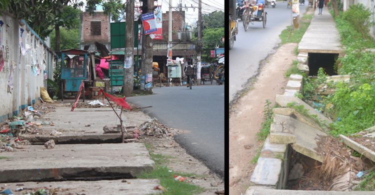 এসব ড্রেনের বেশির ভাগের ওপর ফুটপাত তৈরি হয়েছে। অনেক জায়গায় স্লাব দেয়া হয়েছে। স্লাব দেয়া ড্রেনগুলো ফুটপাত হিসেবে ব্যবহার করেন নাগরিকরা। আবারো এমনও বহু ড্রেন রয়েছে যেগুলোর ওপর নির্মাণের দীর্ঘ দিন পরেও ঢাকনা বসেনি।