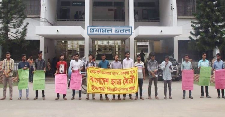 সোমবার (২৩ মে) বেলা ১২ টার দিকে বিশ্ববিদ্যালয়ের প্রশাসন ভবন চত্বরে এ মানববন্ধন অনুষ্ঠিত হয়। এ সময়, বাংলাদেশ ছাত্র মৈত্রীর ইবি শাখার নেতৃবৃন্দরা ৭ দফা দাবি তুলে ধরেন।