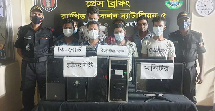প্রেস বিজ্ঞপ্তিতে বলা হয়, জয়পুরহাট র্যাব-৫ ক্যাম্পের একটি অপারেশন দল মঙ্গলবার রাত সাড়ে ১১টায় নওগাঁ সদর উপজেলার হাপানিয়া বাজারে অভিযান চালায়। এ সময় আটকদের কাছে থেকে মনিটর ৭টি, সিপিইউ ৭টি, কি-বোর্ড ৭টি, মাউস ৭টি, হার্ড ডিস্ক ১২টি ও বিভিন্ন প্রকার ক্যাবল জব্দ করা হয়।