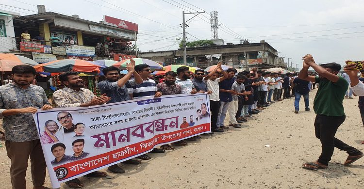 মানবন্ধনে ঝিকরগাছা উপজেলা ছাত্রলীগের সাধারণ সম্পাদক কামাল হোসেন বলেন, বাংলাদেশ ছাত্রলীগ দেশ ও দশের প্রয়োজনে বিভিন্ন আন্দোলন সংগ্রামে অংশ গ্রহণ করে আসছে। জননেত্রী শেখ হাসিনাকে কারাগার থেকে মুক্ত করতে সবার আগে রাজপথে রক্ত দিয়েছিল ছাত্রলীগ। ছাত্রলীগের উপর হামলা আমরা মেনে নেবো না।
