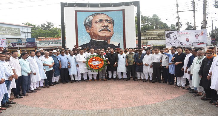 সোমবার বেলা সাড়ে ১১ টায় দিকে শহরের বকুলতলাস্থ বঙ্গবন্ধু ম্যুরালে জেলা আওয়ামী লীগের সভাপতি মুক্তিযোদ্ধা শহিদুল ইসলাম মিলন ও সাধারণ সম্পাদক শাহীন চাকলাদার এমপির নেতৃত্বে শ্রদ্ধা জানানো হয়। এসময় জেলা আওয়ামী লীগের সহযোগী সংগঠনের বিভিন্ন স্তরের নেতৃবৃন্দ উপস্থিত ছিলেন। এর আগে বিভিন্ন স্তরের নেতৃবৃন্দ ম্যুরাল প্রাঙ্গনে জড়ো হন। এর পর আওয়ামী লীগ ও সহযোগী সংগঠনের বিভিন্ন স্তরের নেতৃবৃন্দ কাল ব্যাচ পরিধান করেন।