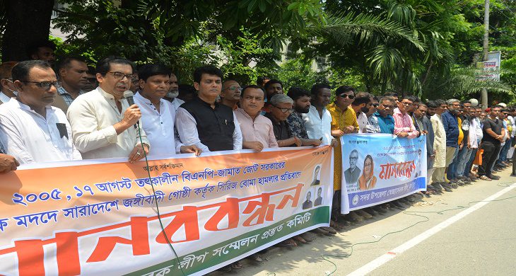 নিজস্ব প্রতিবেদক : ২০০৫ সালের ১৭ আগস্ট একযোগে দেশের ৬৩ জেলার ৫০০ পয়েন্টে সিরিজ বোমা হামলা চালায় জঙ্গি সংগঠন জামাআতুল মুজাহিদীন বাংলাদেশ (জেএমবি)। বুধবার বেলা ১১টায় বোমা হামলার প্রতিবাদে প্রেসক্লাব যশোরের সামনে জেলা স্বেচ্ছাসেবক লীগের প্রস্তুতি কমিটির আহবায়ক আসাদুজামান মিঠু’র সভাপতিত্বে মানববন্ধন কর্মসূচি পালন করা হয়েছে।