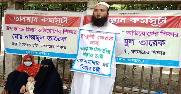 টিপকাণ্ডে চাকরি হারানো পুলিশ সদস্য নাজমুল তারেক চাকরি ফিরে পেতে অবস্থান কর্মসূচি পালন করেছেন। একই সঙ্গে ঘটনার তদন্ত কর্মকর্তাসহ অভিযোগকারী লতা সমাদ্দারের বিচারের দাবি জানান তিনি।