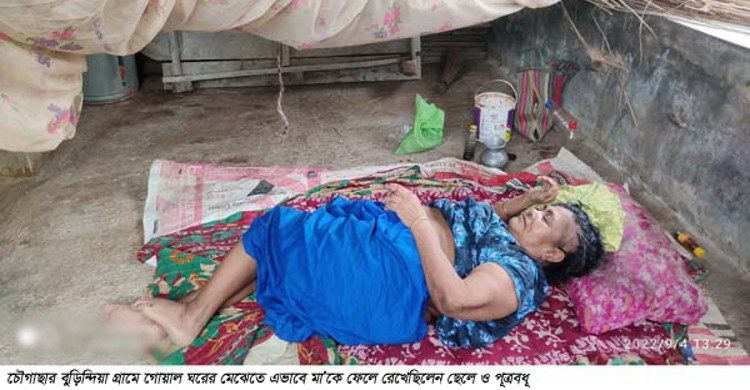 রবিবার দুপুরে ওই বাড়িতে গিয়ে দেখা যায় বৃদ্ধা অসুস্থ মা’ (৬৫) গোয়াল ঘরের ময়লার মধ্যে মেঝেতে একটি কাঁথার উপর প্রায় অর্ধনগ্ন অবস্থায় শুয়ে কাতরাচ্ছেন। গোয়াল ঘরটি ছাদের হলেও তীব্র গরমেও সেখানে নেই কোন বৈদ্যুতিক বা হাতপাখার ব্যবস্থা।