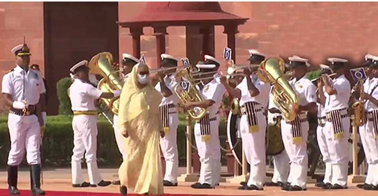এর আগে প্রধানমন্ত্রীকে বর্ণাঢ্য মোটর শোভাযাত্রার মাধ্যমে রাষ্ট্রপতি ভবনের সামনে নিয়ে যাওয়া হয়। এরপর তার সম্মানে গান স্যালুট দেয়া হয়। প্রথমে বেজেছে বাংলাদেশের জাতীয় সংগীত, এরপর ভারতের।
