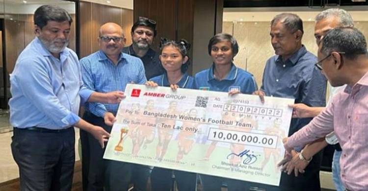 গুলশানে নিজস্ব অফিসে বাংলাদেশ নারী দলের কোচ গোলাম রব্বানী ছোটন, অধিনায়ক সাবিনা খাতুন ও ফাইনালে জোড়া গোল করা কৃঞ্চা রানী সরকারের হাতে আম্বার গ্রুপ তুলে দিয়েছে ১০ লাখ টাকা অর্থ পুরস্কার।