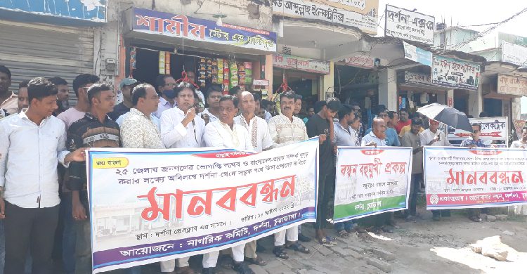 সোমবার (১০ অক্টোবর) সকাল ১০ টার দিকে দর্শনা নাগরিক কমিটির আয়োজনে প্রেসক্লাবের সামনে এ মানববন্ধান অনুষ্ঠিত হয়।