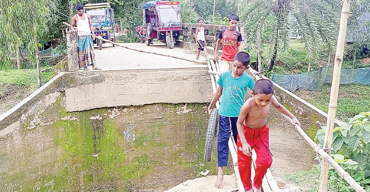 শেরপুরের নালিতাবাড়ী উপজেলায় চার মাসেও সংস্কার হয়নি একটি সেতুর ভেঙে যাওয়া সংযোগ সড়ক। ফলে স্থানীয় লোকজন ঝুঁকি নিয়ে সেতুতে উঠতে বাঁশের সাঁকো ব্যবহার করছে। এতে ভোগান্তিতে পড়েছে ৮ গ্রামের প্রায় ২০ হাজার মানুষ।