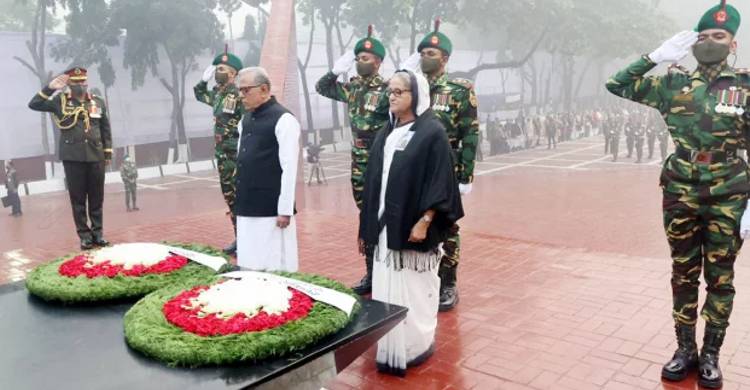 পুষ্পস্তবক অর্পণের পর রাষ্ট্রপতি ও প্রধানমন্ত্রী ১৯৭১ সালের মহান মুক্তিযুদ্ধে বীর শহীদদের স্মৃতির প্রতি গভীর শ্রদ্ধা জানিয়ে সেখানে কিছুক্ষণ নীরবে দাঁড়িয়ে থাকেন।
