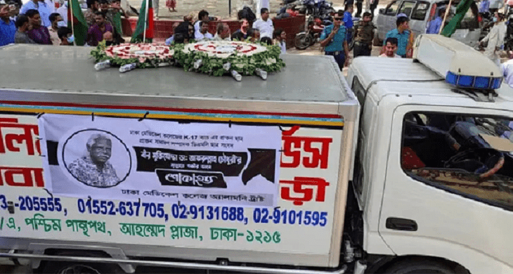 কেন্দ্রীয় শহীদ মিনারে নেয়া হয়েছে গণস্বাস্থ্য কেন্দ্রের প্রতিষ্ঠাতা ও ট্রাস্টি বীর মুক্তিযোদ্ধা ডা. জাফরুল্লাহ চৌধুরীর মরদেহ।