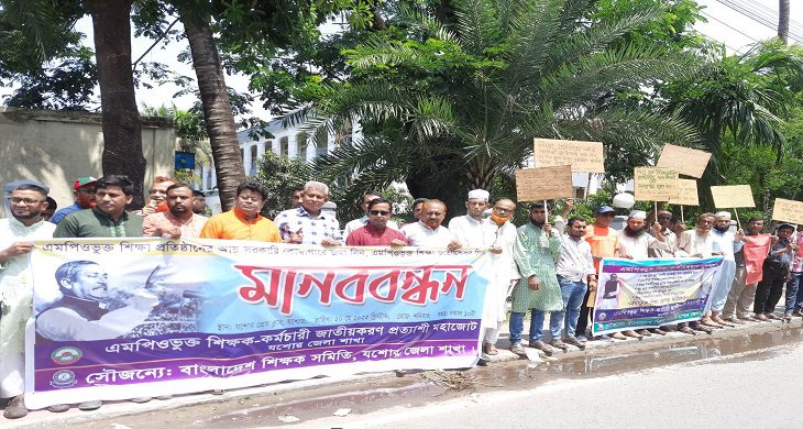এমপিও ভুক্ত শিক্ষা প্রতিষ্ঠানকে জাতীয়করণের দাবিতে মানবন্ধন কর্মসূচি পালিত হয়েছে। শনিবার সকাল সাড়ে ১০টায় প্রেসক্লাব যশোরের সামনেএমপিও ভুক্ত শিক্ষক-কর্মচারী জাতীয়করণ প্রত্যাশী মহাজোট যশোর জেলা শাখার উদ্দ্যগে মানবন্ধন হয়।