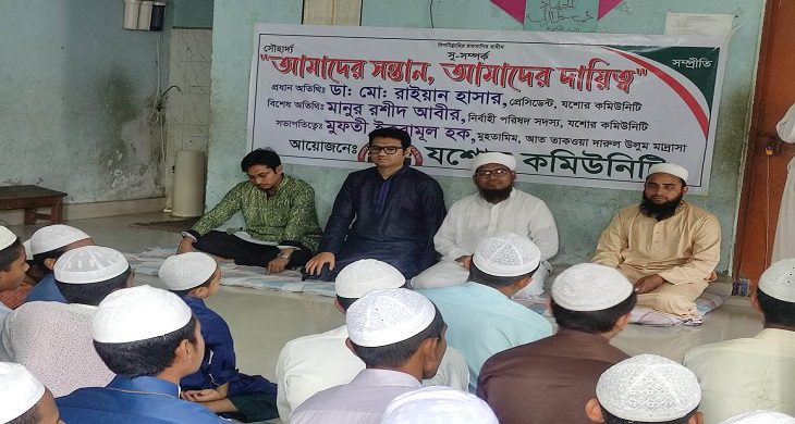 অনুষ্ঠানে প্রধান অতিথির বক্তব্যে যশোর কমিউনিটি প্রেসিডেন্ট ডাঃ মোঃ রাইয়ান হাসার বলেন, ঢাকা উদ্যানে আমার চেম্বার আছে। এখানে অধ্যয়নরত সকলের জন্য আমার চেম্বারে ভিজিট ফ্রি৷ আপনাদের কোন অসুখ হলে নির্দ্বিধায় আপনারা আমার কাছে চলে আসবেন। আপনাদের বার্ষিক পরীক্ষায় যারা প্রথম স্থান অর্জন করবেন তাদের জন্য প্রতি বছর যশোর কমিউনিটির পক্ষ থেকে উপহার থাকবে ইনশাআল্লাহ। আপনারা পড়ালেখা করে ভাল মানুষ হওয়ার চেষ্টা করবেন সেই দোয়া করি। অনুষ্ঠানে যশোর কমিউনিটির নির্বাহী পরিষদ সদস্য মামুন অর রশিদ আবির, অত্র মাদ্রাসার মুহতারিম মুফতি ইকরামুল হক সাহেব সব যশোর কমিউনিটির সদস্যবৃন্দ উপস্থিত ছিলেন।