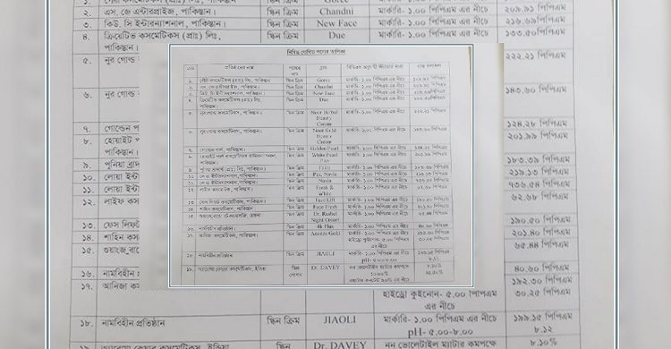 পাকিস্তানের গৌরী কসমেটিকসের (প্রা.) গৌরী ক্রিম, এসজে এন্টারপ্রাইজের চাঁদনী ক্রিম, কিউসি ইন্টারন্যাশনালের নিউ ফেস, ক্রিয়েটিভ কসমেটিকসের ডিউ, নুর গোল্ড কসমেটিকসের নুর হারবাল বিউটি ক্রিম, নুর গোল্ড কসমেটিকসের নুর গোল্ড বিউটি ক্রিম, গোল্ডেন পার্ল কোম্পানির গোল্ডেন পার্ল ক্রিম, হোয়াইট পার্ল কসমেটিকস ইন্টারন্যাশনালের হোয়াইট পার্ল ক্রিম, পুনিয়া ব্রাদার্স (প্রা.) লিমিটেডের ফাইজা ক্রিম, লোয়া ইন্টারন্যাশনালের পাক্স ও নাভিয়া ক্রিম, লাইফ কসমেটিকসের ফ্রেশ অ্যান্ড হোয়াইট ক্রিম, ফেস লিফট কসমেটিকসের ফেস লিফট ক্রিম, শাহিন কসমেটিকসের ফেস ফ্রেশ ক্রিম ও আনিজা কসমেটিকসের আনিজা গোল্ড।