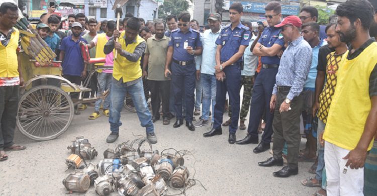 যশোরে জেলা আইনশৃঙ্খলা কমিটির সভায় সিদ্ধান্ত গ্রহণের পরের দিনেই সোমবার (১১ সেপ্টেম্বর) সকাল ১০ টা থেকে বেলা সাড়ে ১২টা পর্যন্ত শহরে অভিযান চালিয়ে ইঞ্জিনচালিত অবৈধ রিকশার মোটর খুলে নিয়ে তা ধ্বংস করেছে পৌরসভা ও ট্রাফিক বিভাগ।