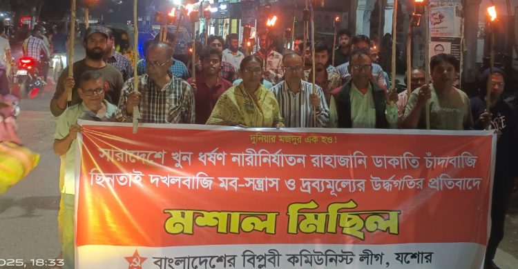 সারাদেশে ক্রমবর্ধমান খুন, ধর্ষণ, নারী ও শিশু নির্যাতন, ডাকাতি, ছিনতাই, চাঁদাবাজি, দখলবাজি, মব সন্ত্রাস ও নিত্যপ্রয়োজনীয় দ্রব্যের মূল্যবৃদ্ধির প্রতিবাদে যশোর জেলা বিপ্লবী কমিউনিস্ট লীগ বুধবার সন্ধ্যা ৭টায় মশাল মিছিল বের করে।