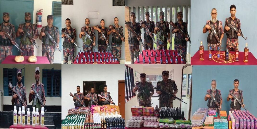 বিজিবি সূত্রে জানা গেছে, বেনাপোল, পাঁচপীরতলা, রঘুনাথপুর বিওপি, বেনাপোল আইসিপি এবং আমড়াখালী চেকপোস্ট এলাকায় একযোগে এসব অভিযান পরিচালনা করা হয়। অভিযানে ভারতীয় ফেনসিডিল, গাঁজা, মোটরসাইকেল, শাড়ি, কম্বল, থ্রিপিস, চকলেট, ওষুধ এবং বিভিন্ন কসমেটিকস সামগ্রী উদ্ধার করা হয়।