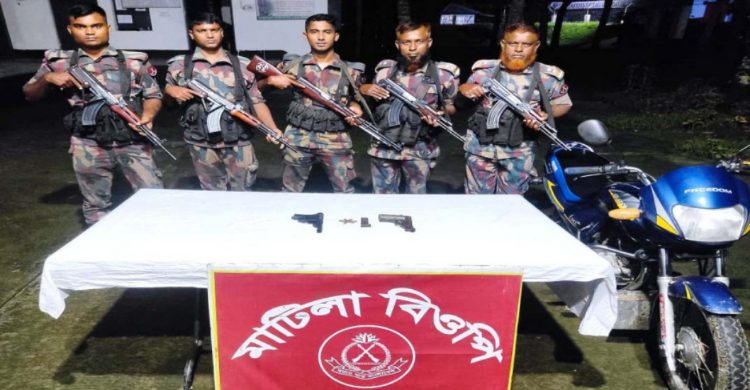 ঝিনাইদহের মহেশপুর উপজেলার মাঠিলা সীমান্ত এলাকায় অভিযান চালিয়ে একাধিক অবৈধ অস্ত্র ও গুলি উদ্ধার করেছে বর্ডার গার্ড বাংলাদেশ (বিজিবি)। অভিযানে একটি বিদেশি পিস্তল, একটি দেশীয় ওয়ান শুটার গান, ছয় রাউন্ড গুলি ও একটি মোটরসাইকেল জব্দ করা হয়।