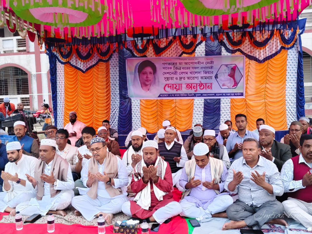 শার্শা (যশোর): গণতন্ত্রের মা, আপোষহীন দেশনেত্রী ও সাবেক তিনবারের প্রধানমন্ত্রী বেগম খালেদা জিয়ার আশু রোগমুক্তি কামনায় যশোরের শার্শা থানার অন্তর্গত ৭ নং কায়বা ইউনিয়নের চালিতাবাড়িয়া আর. ডি. বহুমুখী মাধ্যমিক বিদ্যালয় মাঠে এক বিশেষ দোয়া মাহফিল অনুষ্ঠিত হয়েছে। কায়বা ইউনিয়ন বিএনপি ও এর অঙ্গ–সহযোগী সংগঠনের উদ্যোগে এই অনুষ্ঠান আয়োজিত হয়।