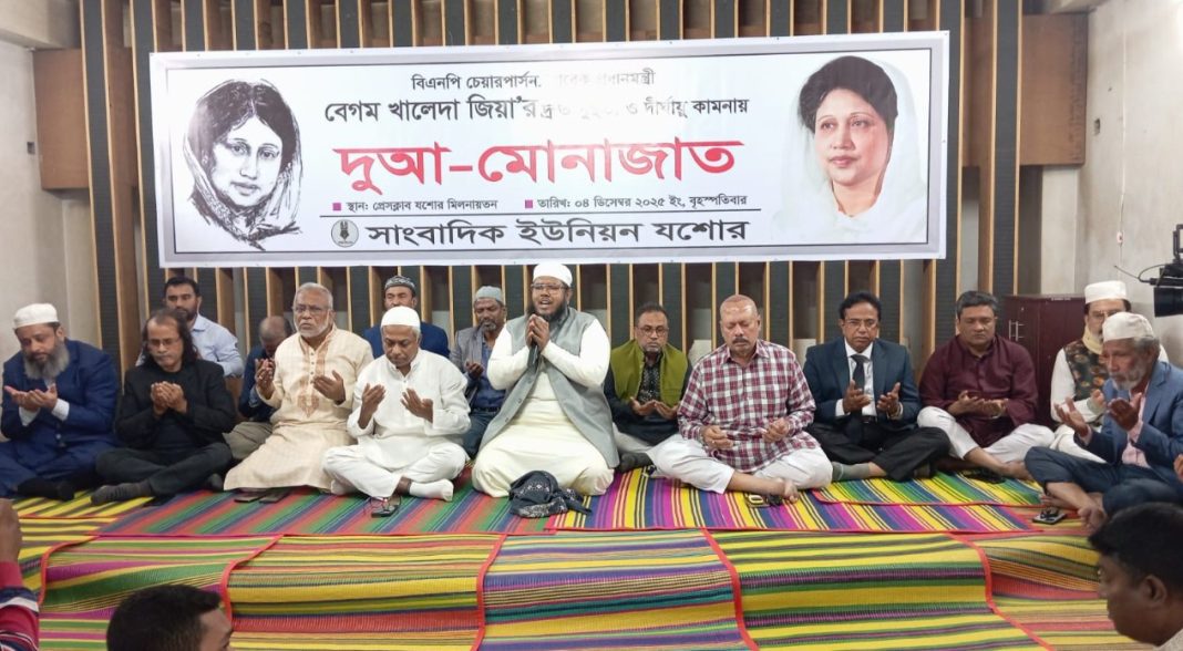 : গুরুতর অসুস্থ বিএনপি চেয়ারপারসন ও সাবেক প্রধানমন্ত্রী বেগম খালেদা জিয়ার সুস্থতা ও দীর্ঘায়ু কামনায় সাংবাদিক ইউনিয়ন যশোরের উদ্যোগে এক বিশেষ দোয়া মাহফিল অনুষ্ঠিত হয়েছে। বৃহস্পতিবার (৪ ডিসেম্বর ২০২৫) প্রেসক্লাব যশোরের শহীদ গোলাম মাজেদ অডিটোরিয়ামে এই দোয়া মাহফিলটি আয়োজিত হয়মুনাজাতের আগে সংক্ষিপ্ত বক্তব্য রাখেন বিএনপির ভারপ্রাপ্ত সাংগঠনিক সম্পাদক (খুলনা বিভাগ) অনিন্দ্য ইসলাম অমিত। তিনি বলেন,