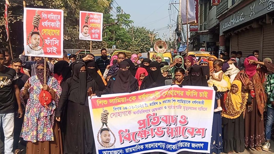 যশোর সদর উপজেলার ফতেপুর ইউনিয়নের রায়মানিক গ্রামে নয় বছরের এক শিশু ধর্ষণের ঘটনায় স্থানীয় এলাকাবাসী ক্ষোভে ফুঁসছে। অভিযুক্ত ধর্ষক সোহাগের দ্রুত গ্রেপ্তার ও সর্বোচ্চ শাস্তির (ফাঁসির) দাবিতে বুধবার দুপুরে শহরে এক বিশাল বিক্ষোভ মিছিল ও মানববন্ধন কর্মসূচি পালিত হয়েছে।