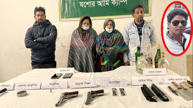 যশোর প্রতিনিধি: যশোরের ঢাকারোড এলাকায় চিহ্নিত সন্ত্রাসী ও যুবলীগ নামধারী ক্যাডার আরিফের বাড়িতে গভীর রাতে অভিযান চালিয়েছে যৌথ বাহিনী। আড়াই ঘণ্টাব্যাপী এই অভিযানে বিপুল পরিমাণ দেশি-বিদেশি অস্ত্র ও মাদক উদ্ধার করা হলেও মূল অভিযুক্ত আরিফ কৌশলে পালিয়ে গেছেন। তবে তার দুই ভাই ও দুই স্ত্রীকে আটক করা হয়েছে।