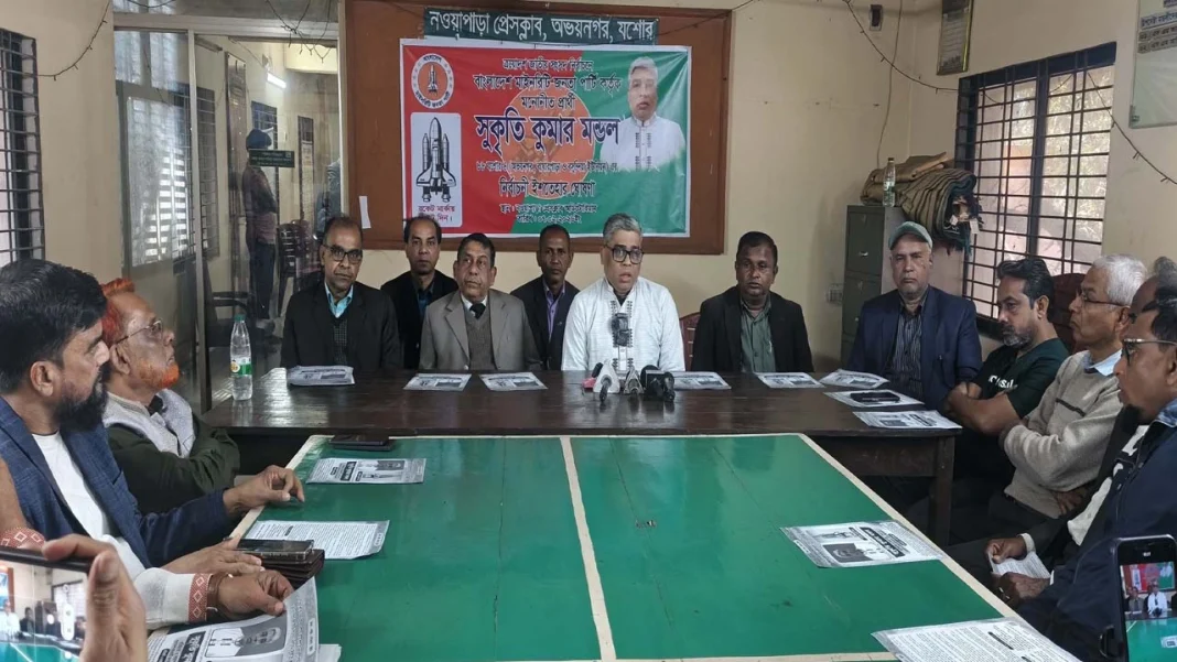 আসন্ন ত্রয়োদশ জাতীয় সংসদ নির্বাচনে যশোর-৪ (অভয়নগর, বাঘারপাড়া ও বসুন্দিয়া) আসনে বাংলাদেশ মাইনরিটি জনতা পার্টি (বিএমজেপি) মনোনীত প্রার্থী সুকৃতি কুমার মণ্ডল তার নির্বাচনী ইশতেহার ঘোষণা করেছেন। শনিবার (৭ ফেব্রুয়ারি) দুপুরে অভয়নগর উপজেলার নওয়াপাড়া প্রেসক্লাব অডিটোরিয়ামে এক সংবাদ সম্মেলনের মাধ্যমে তিনি ‘রকেট’ মার্কার পক্ষে এই উন্নয়ন রূপরেখা তুলে ধরেন।