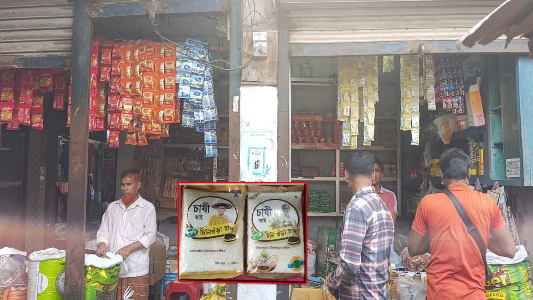 শনিবার (৭ মার্চ) সকালে বাগআঁচড়া বাজারের চিনি পট্টির ‘মেসার্স আরিফ স্টোর’ থেকে জয়নাল নামে এক ক্রেতা এক কেজি মোড়কজাত পোলাওয়ের চাল ক্রয় করেন। দোকানদার আরিফ হোসেন তাকে ‘চাষী ভাই’ সুগন্ধি চিনিগুঁড়া চালের একটি প্যাকেট দেন, যার দাম রাখা হয় ১৭০ টাকা। অভিযোগ উঠেছে, প্যাকেটটি দেখতে হুবহু দেশের শীর্ষস্থানীয় শিল্পগ্রুপ স্কয়ারের ‘চাষী’ ব্র্যান্ডের মতো। সাধারণ ক্রেতাদের পক্ষে এই সূক্ষ্ম জালিয়াতি ধরা প্রায় অসম্ভব।