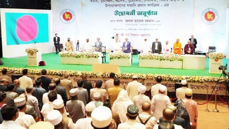 ্ধ্র্মি সম্প্রীতি ও সেবকদের সামাজিক মর্যাদা বৃদ্ধিতে এক অনন্য নজির স্থাপন করল সরকার। যশোর জেলার তিনটি মসজিদের ইমাম, মুয়াজ্জিন ও খাদেম এবং একটি মন্দিরের পুরোহিত প্রথমবারের মতো সরাসরি রাষ্ট্রীয় সম্মানী ভাতা লাভ করেছেন। শনিবার (১৪ মার্চ) সকালে রাজধানীর ওসমানী স্মৃতি মিলনায়তনে আয়োজিত এক অনুষ্ঠানে প্রধানমন্ত্রী শেখ হাসিনা নিজে তাদের হাতে এই সম্মানী তুলে দেন।